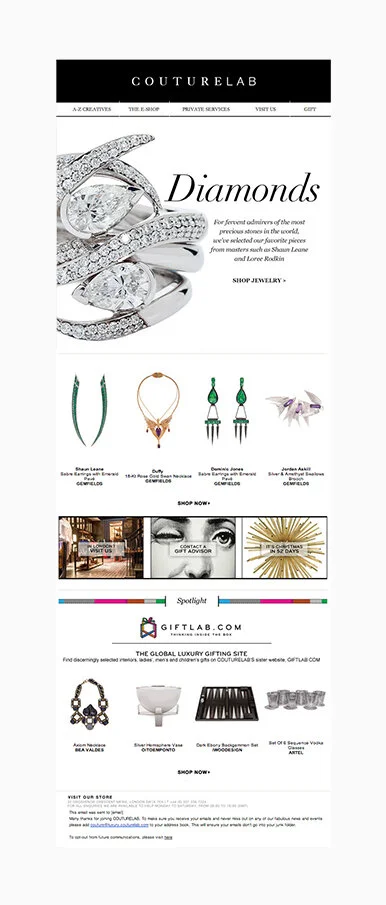 I was also responsible for maintaining GiftLab’s sister brand CoutureLab, being mindful of keeping the distinct visual identities separate but cohesive. Primarily telling the brand stories of global creatives and curating a range of high end of luxury wearables, I worked on emails and website banners with minimal luxury aesthetic to showcase the standout work of the designer’s we worked with.