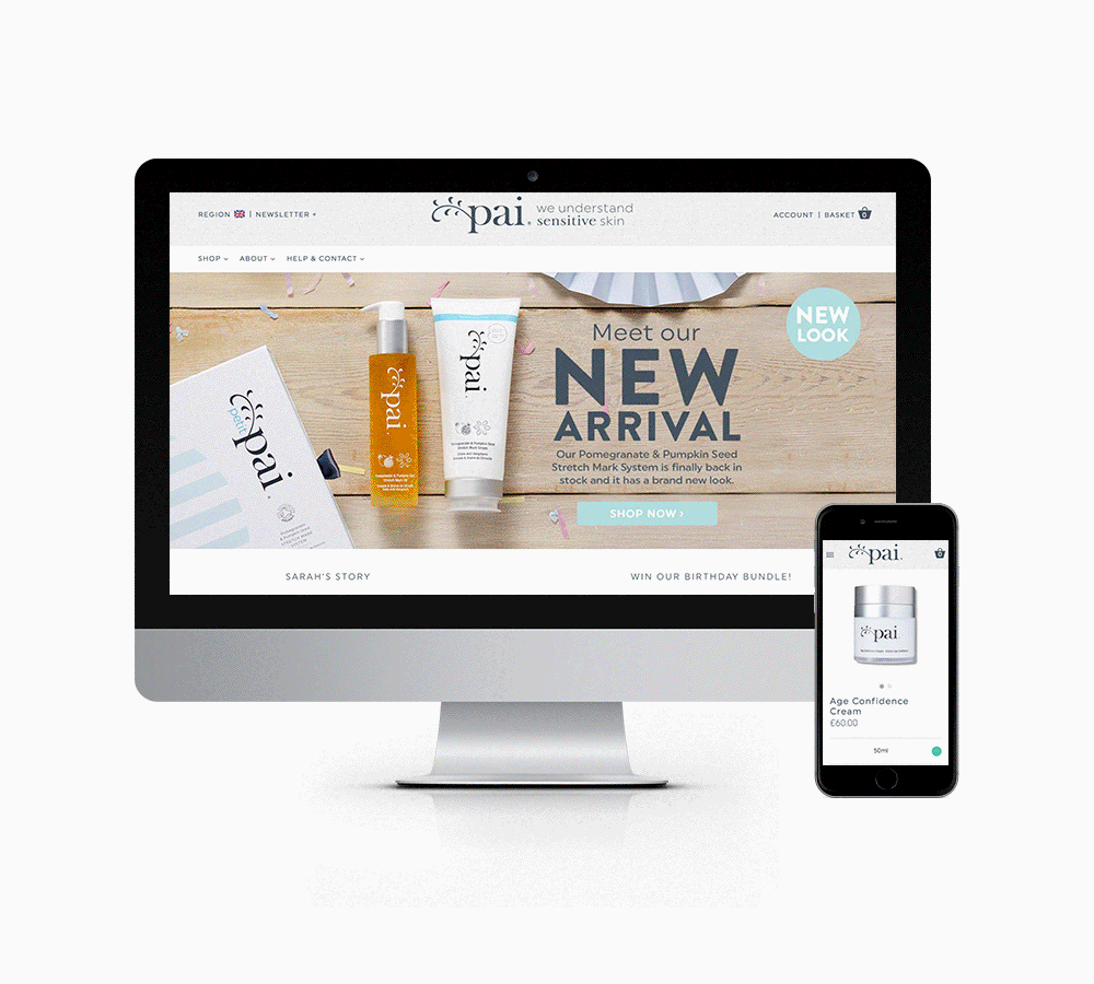 Wireframing, responsive prototyping & design elements of all aspects of UK & International websites. When I first began my employment, the sites were built on an archaic system and lacked the visual finesse and consistency to do the Pai brand justice. After being instrumental in our full website overhaul in 2016, my ongoing goal is to bring the brand tone of voice to life, ensuring the clean but playful output is as refreshing and organic as the products themselves.